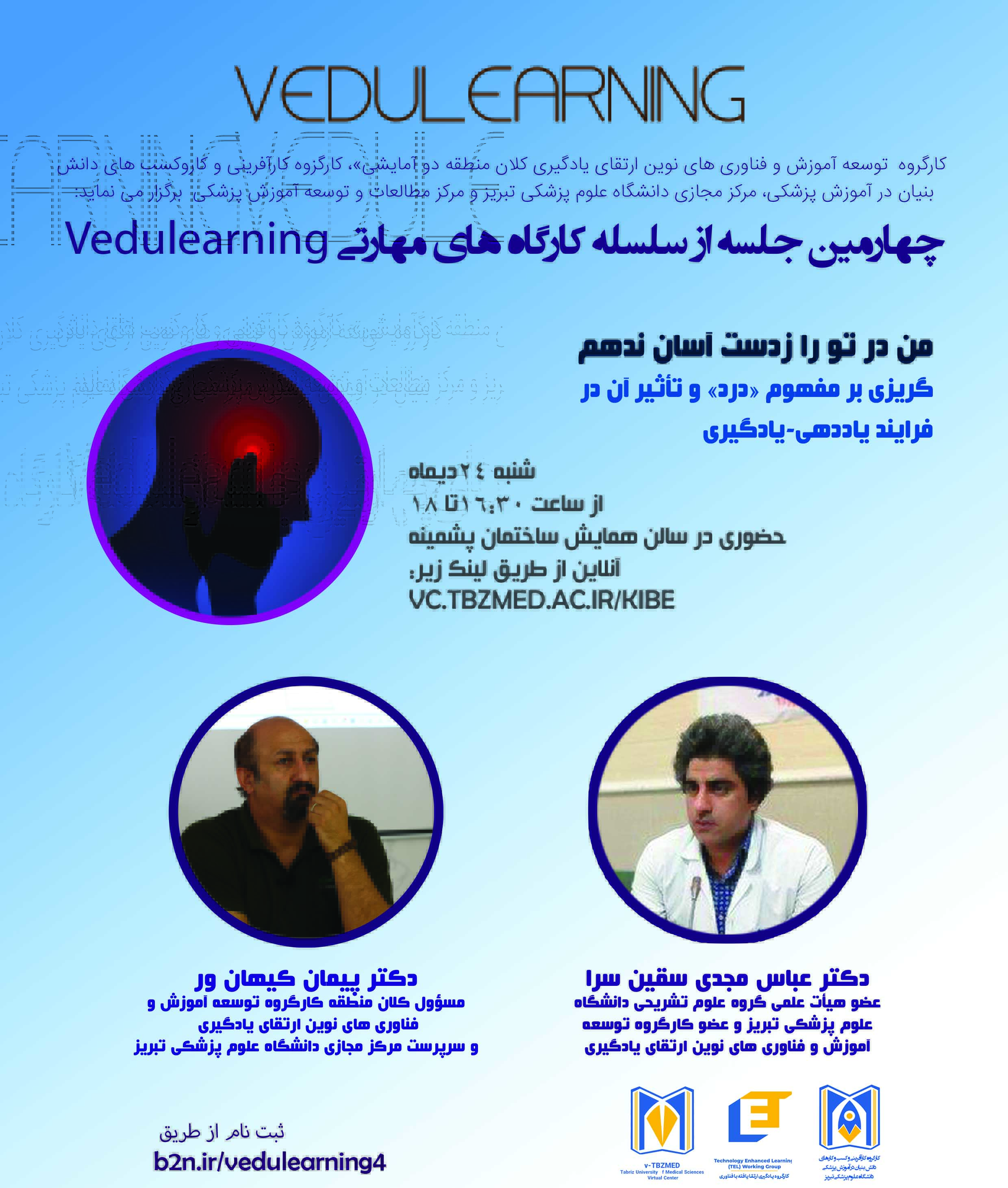 VEduLearning سلسله کارگاه های توانمندسازی اساتید و دانشجویان در رابطه با مفاهیم نوین آموزش مجازی و رَوَندها و اَبَررَوَندهای فناورانه مرتبط می باشد که توسط مرکز مجازی دانشگاه علوم پزشکی تبریز و به پیشنهاد استاد نوآور، جناب آقای دکتر عباس مجدی سقین سرا طراحی گشته است و در آن مباحث جدید سایکو-نوروبیولوژیک فرایند یاددهی-یادگیری بررسی می شود که می تواند جهت اعضای هیأت علمی و دانشجویان بسیار راهگشا باشد.