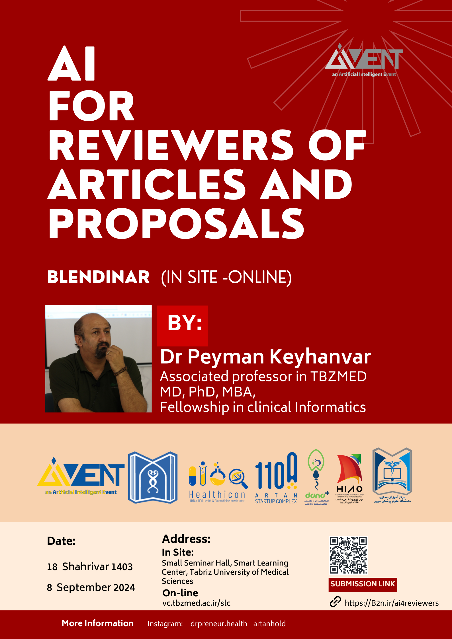 علاقمندان می توانند در سالن بزرگ مرکز مطالعات به صورت حضوری در جلسه شرکت نمایند. در ضمن جهت دریافت گواهی و برنامه ریزی برای مدیریت بهتر سالن متناسب با تعداد شرکت کنندگان ثبت نام از طریق لینک https://B2n.ir/ai4reviewersا الزامی می باشد