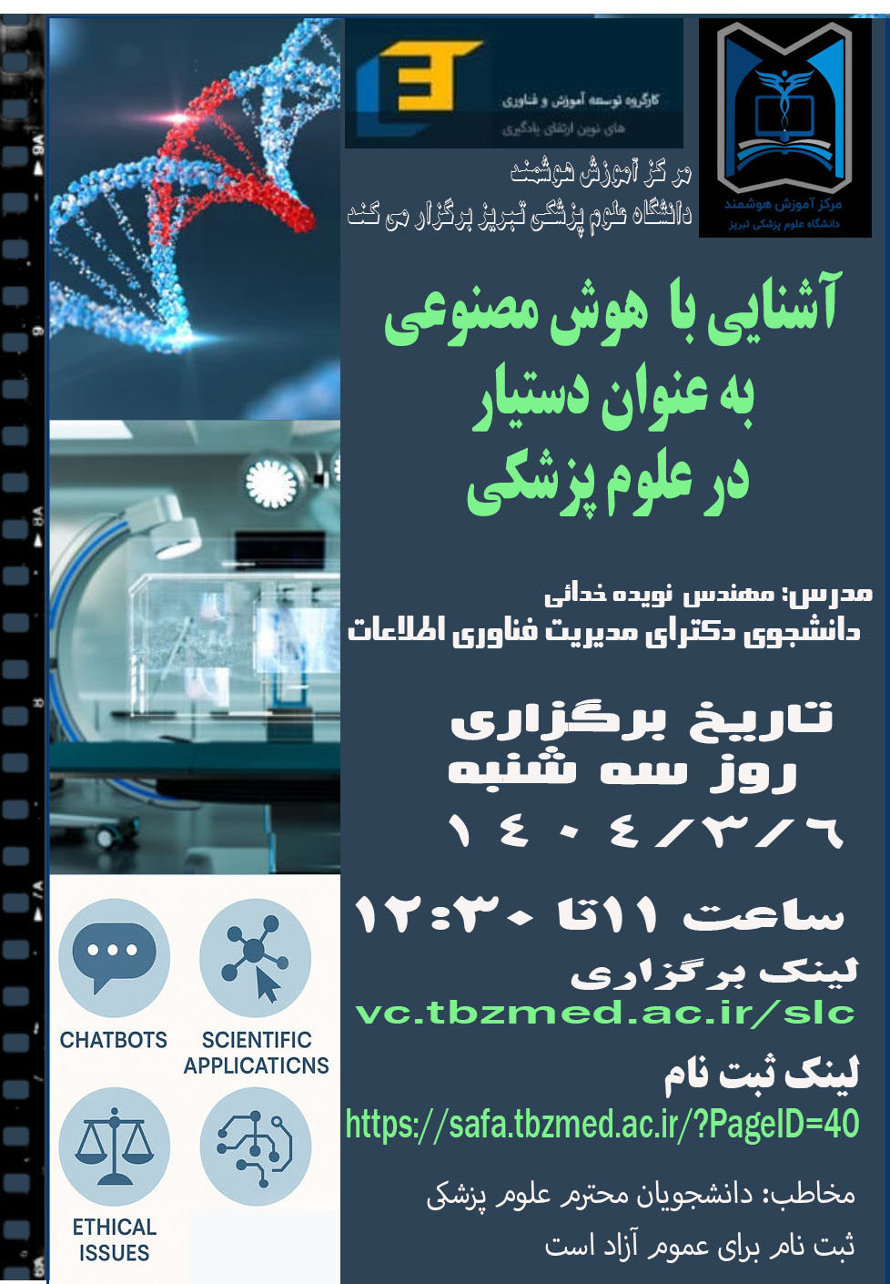 کارگاه آشنایی با هوش مصنوعی به عنوان دستیار در علوم پزشکی در تاریخ 1404/3/6 برگزار می شود.